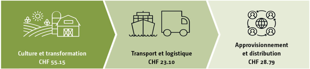 Dans la boutique en ligne de Crowd Container, il existe pour chaque produit une ventilation du prix final (voir graphique). «Nous rendons la chaîne de création de valeur transparente, afin que l’ensemble des consommateurs et des producteurs puisse voir combien d’argent est dépensé et où. Beaucoup ne savent pas que la transparence est également importante pour les personnes travaillant dans les champs et dans la production», explique Benjamin. La proximité, des valeurs communes et une base de confiance minimisent également le risque de pratiques commerciales abusives. Si, en Suisse, ce sont surtout les familles paysannes elles-mêmes avec lesquelles Crowd Container travaille au quotidien, à l’étranger, ce sont les coopératives. «La force des coopératives, c’est de pouvoir générer des valeurs par le biais de la quantité et de la transformation des produits qu’un petit paysan ne peut pas produire seul», explique Benjamin. De cette manière, une plus grande partie de la valeur ajoutée reste chez les paysans.