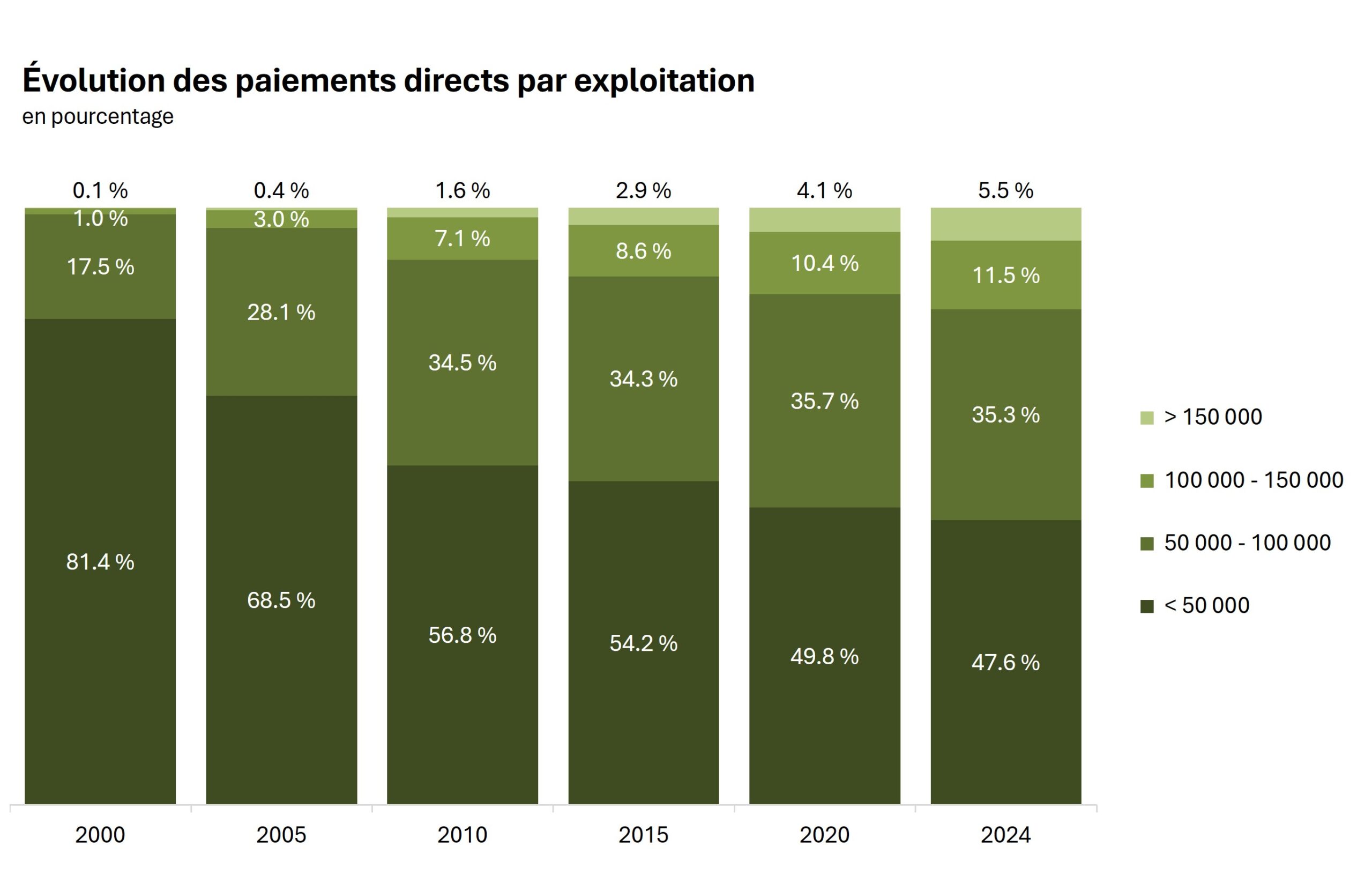 Les exploitations de plus en plus grandes reçoivent également des sommes importantes des paiements directs. Cependant, les économies d’échelle font que les grandes exploitations peuvent fournir des presta-tions à des prix plus avantageux que les petites. En outre, le fait que des sommes toujours plus importantes soient versées à des exploitations individuelles nuit toutefois à l’acceptation des paiements directs par la population. Une dégressivité des paiements directs serait donc justifiée.
