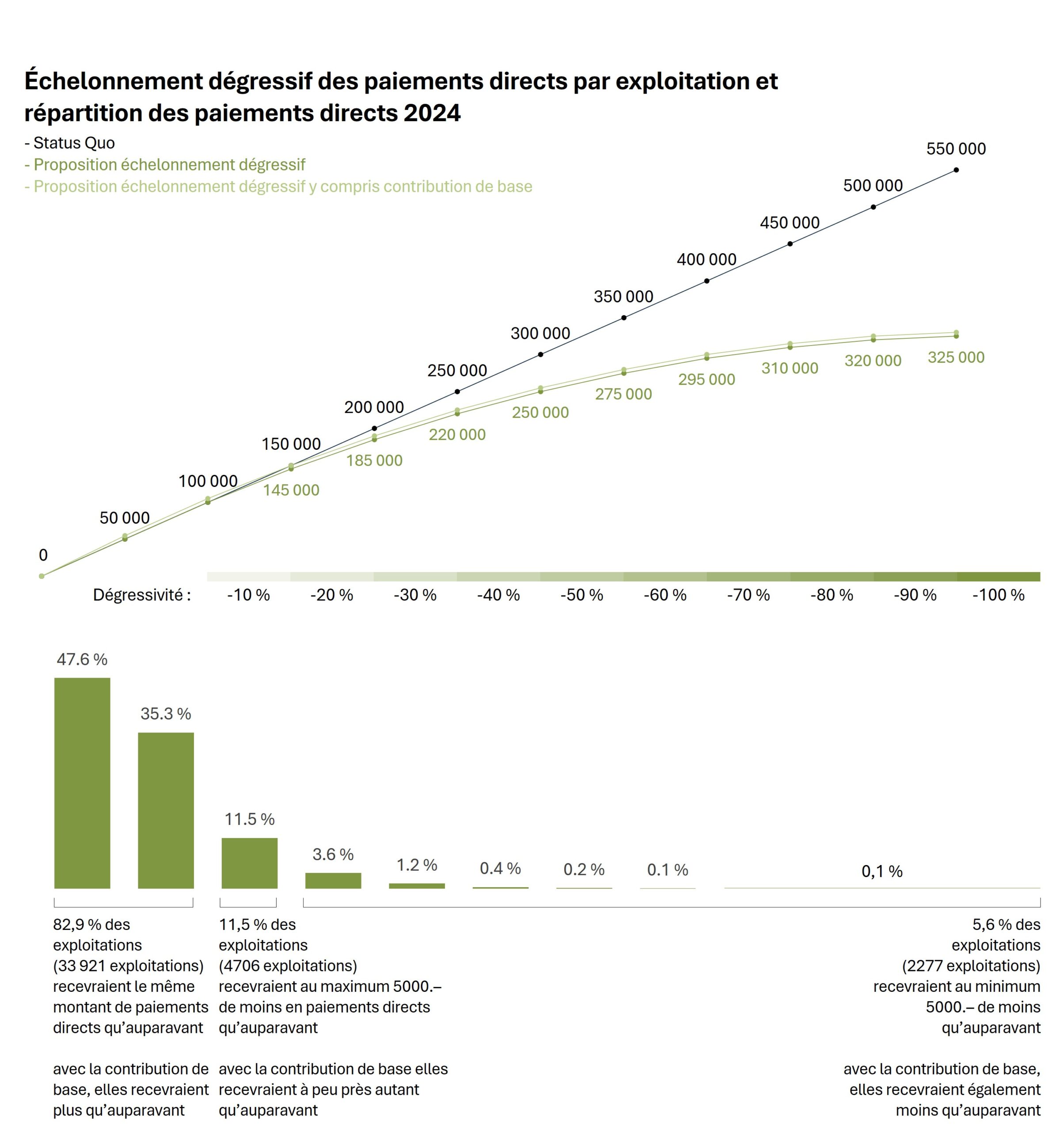 Avec l’intervention soutenue par des membres de tous les groupes parlementaires, il est proposé que les paiements directs soient dégressifs par paliers de 50 000 francs à partir d’un montant de contribution an-nuel de 100 000 francs par exploitation. La réduction pourrait progresser de 10 pour cent par palier. Pour une exploitation bénéficiant de paiements directs de 150 000 francs, la réduction serait ainsi de 5 000 francs (10 % entre 100 000 et 150 000 francs). Pour une exploitation bénéficiant de paiements directs de 200 000 francs, la réduction serait ainsi de 15 000 francs (10 % entre 100 000 et 150 000 francs + 20 % entre 150 000 et 200 000 francs), etc. Pour les communautés d’exploitation, les montants seraient multi-pliés par le nombre d’exploitations regroupées. Nous avons illustré cette proposition à la page suivante.