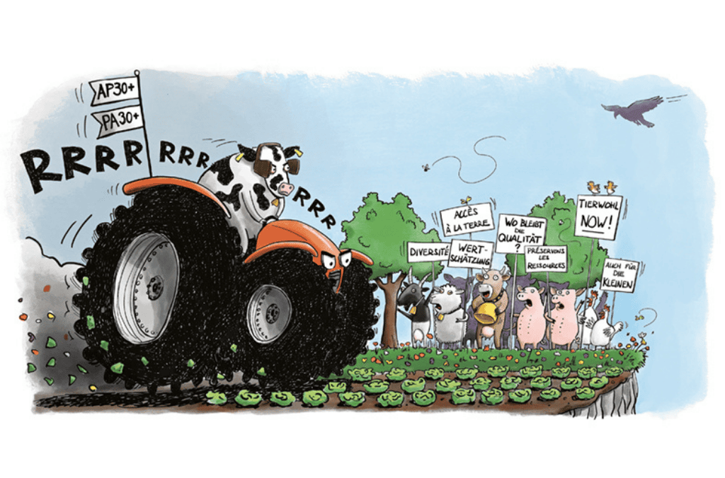 Toutefois, des initiatives cherchant à s’écarter de cette stratégie qualitative se dessinent. Diverses mesures faisant partie du contre-projet non officiel aux initiatives pour une eau potable propre et contre les pesticides de synthèse ont déjà été supprimées (par exemple dans le domaine des surfaces de compensation écologiques). Au Parlement, plusieurs interventions sont en cours actuellement en vue d’assouplir les prescriptions relatives au bien-être animal et à la protection des eaux et d’abaisser les normes d’homologation des produits phytosanitaires. L’Association des petits paysans s’engage pour maintenir une forte qualité dans l’agriculture et la filière alimentaire en Suisse et l’ancrer dans la politique agricole 2030+.
