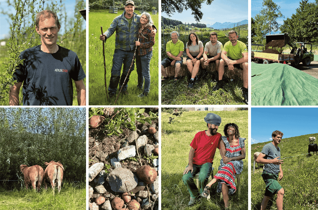 De l’économie laitière aux cultures et maraîchage véganes Les exploitations agricoles nominées montrent toute la diversité des branches de production (galerie de photos de haut en bas) : à Pratval (GR) pour leur ferme Biohof Frigg, Flurin Frigg et Vera Bracher misent sur une production laitière efficiente et saisonnière avec leur propre fourrage et une stratégie du troupeau, des cycles fermés propres à la ferme et une installation de compostage. Sur leur ferme Las Sorts à 1000 mètres d’altitude à Filisur (GR), qui fait partie de notre réseau, Sabina et Marcel Heinrich-Tschalèr montrent que l’agriculture régénérative est également possible en montagne avec une formation d’humus cohérente, une exploitation intelligente des pâturages et une détention d’animaux durable. Sur sa ferme Adlerzart à Oberrüti (AG), Pirmin Adler transforme le paysage avec l’agroforesterie et des haies fourragères : pour le climat, la biodiversité, et le bien-être animal. À Noflen (BE), la pépinière bio Glauser de Jürg et Lukas Glauser est nominée pour son projet de pyrolyse et de rétention d’eau combinant encore plus efficacement la pépinière et l’exploitation agricole. À la Ferme du Château à Combremont-le-Grand (VD), Bruno et Cathy Graf font des grandes cultures et du maraîchage véganes de manière cohérente sur 20 hectares sans produits animaux, mais avec paillage, engrais verts et cultures associées.