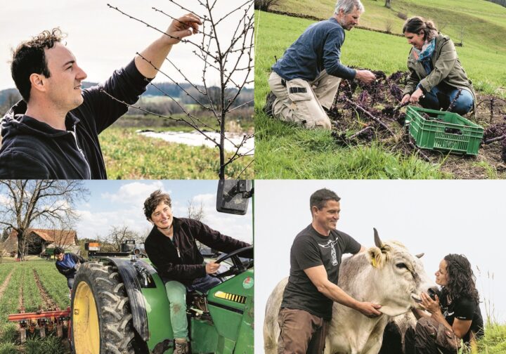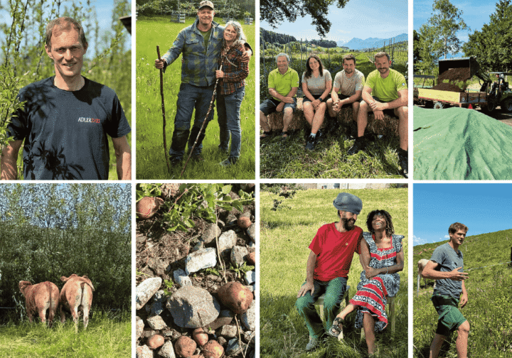 De l’économie laitière aux cultures et maraîchage véganes Les exploitations agricoles nominées montrent toute la diversité des branches de production (galerie de photos de haut en bas) : à Pratval (GR) pour leur ferme Biohof Frigg, Flurin Frigg et Vera Bracher misent sur une production laitière efficiente et saisonnière avec leur propre fourrage et une stratégie du troupeau, des cycles fermés propres à la ferme et une installation de compostage. Sur leur ferme Las Sorts à 1000 mètres d’altitude à Filisur (GR), qui fait partie de notre réseau, Sabina et Marcel Heinrich-Tschalèr montrent que l’agriculture régénérative est également possible en montagne avec une formation d’humus cohérente, une exploitation intelligente des pâturages et une détention d’animaux durable. Sur sa ferme Adlerzart à Oberrüti (AG), Pirmin Adler transforme le paysage avec l’agroforesterie et des haies fourragères : pour le climat, la biodiversité, et le bien-être animal. À Noflen (BE), la pépinière bio Glauser de Jürg et Lukas Glauser est nominée pour son projet de pyrolyse et de rétention d’eau combinant encore plus efficacement la pépinière et l’exploitation agricole. À la Ferme du Château à Combremont-le-Grand (VD), Bruno et Cathy Graf font des grandes cultures et du maraîchage véganes de manière cohérente sur 20 hectares sans produits animaux, mais avec paillage, engrais verts et cultures associées.