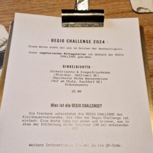 Comme les années précédentes, l’Association des petits paysans a participé à divers événements passionnants sur le thème de l’alimentation durable pendant le Regio Challenge, comme un « Regio Znacht » au Bistro Karl der Grosse à Zurich en collaboration avec Ernährungsforum Zurich. Autre source d’inspiration pour repenser l’achat de nos denrées alimentaires, le documentaire « Ernte teilen » (partager la récolte) a été projeté dans diverses manifestations liées au Regio Challenge. Dans le parc naturel régional du Gantrisch et le parc régional Chasseral, tous deux partenaires du Regio Challenge en 2024, quatre projections de films se sont déroulées avec des tables rondes et des apéritifs Regio Challenge.