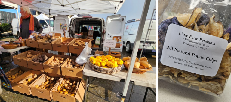 David Little cultive avec sa fille sur l’exploitation Little Farm Petaluma principalement différentes variétés de tomates et de pommes de terre de plein de formes et de couleurs différentes, ainsi que quelques légumes, avec des techniques de dry farming qui permettent la culture en sol aride, sans irrigation ou utilisation d’eau. Avec la hausse des coûts de production, il a dû vendre à contre-cœur les terres agricoles qui appartenaient à sa famille depuis 3 générations, et loue désormais d’autres terres plus éloignées de la Baie de San Francisco. Leurs chips de pommes de terre coupées et frites à la main sont très appréciées dans la région! (Ferry Plaza Farmers Market)